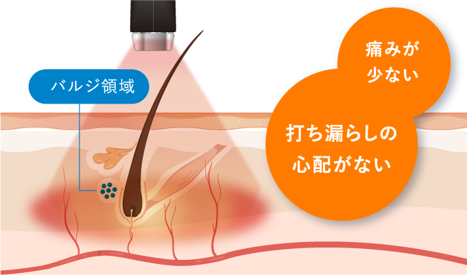 医療レーザー脱毛とは、皮膚や毛髪に含まれるメラニン色素に対してレーザーを照射し、毛髪を再生させる組織にダメージを与える脱毛方法です。一度レーザーで破壊された毛髪組織からは毛が生えてくることはなく、サロン脱毛と違い、半永久的な脱毛効果が得られます。また、医療レーザーは黒いメラニン色素のみに反応するため、周囲の皮膚にダメージを与えることがほとんどありません。 詳しくはこちら
