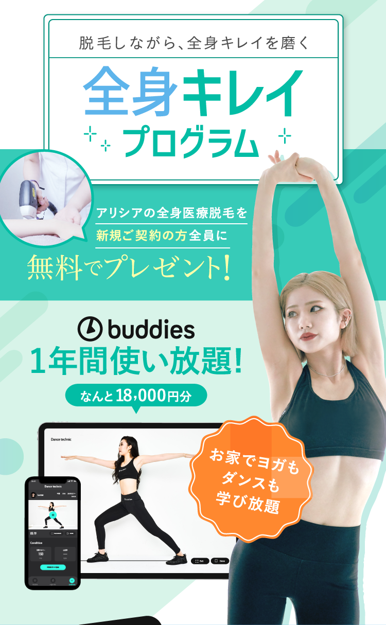 アリシアクリニックは、全⾝キレイプログラムを全身医療脱毛新規ご契約のみなさま全員に無料でプレゼントすることによって、運動をライフスタイルに取り⼊れる「きっかけ」づくりをお⼿伝いします。美肌だけでなく、ココロとカラダの健康とボディメイクを⼿に⼊れることで、全⾝キレイを⽬指しましょう!