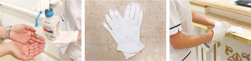 入口にて手指消毒と、お渡しする使い捨て手袋の着用のご協力をお願いいたします(全スタッフも手袋を着用)。